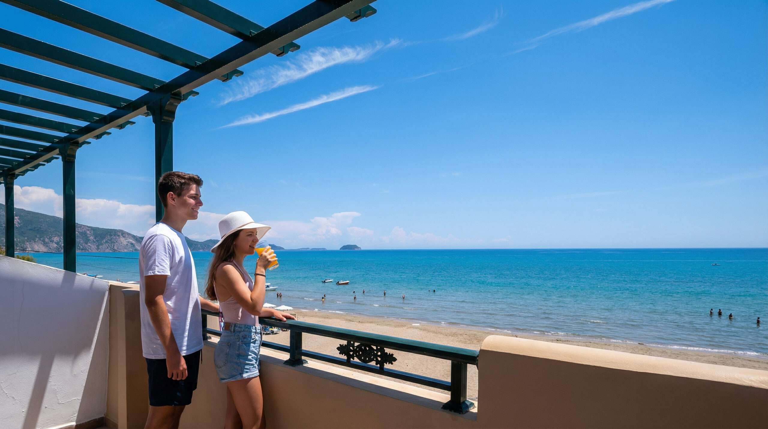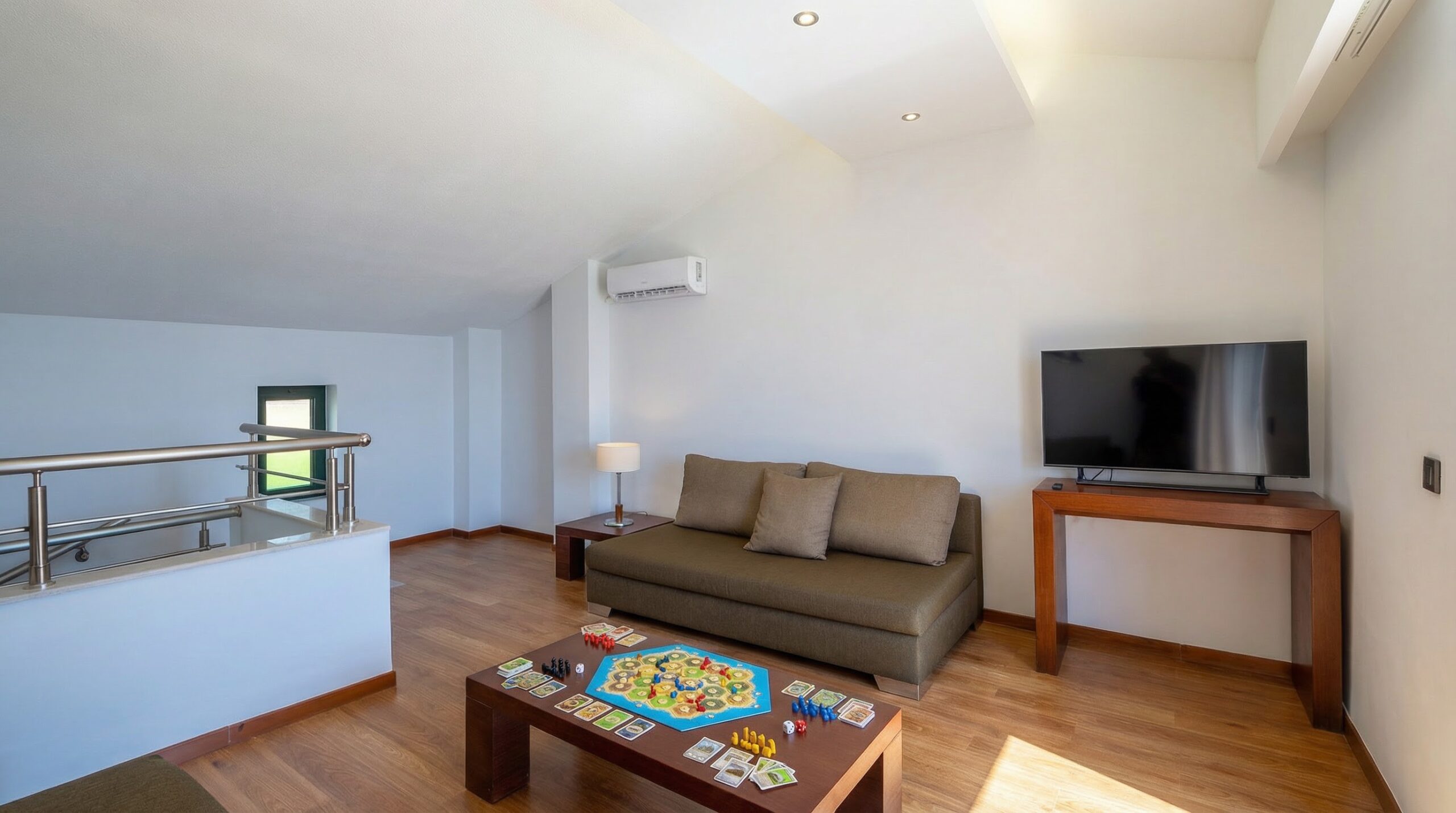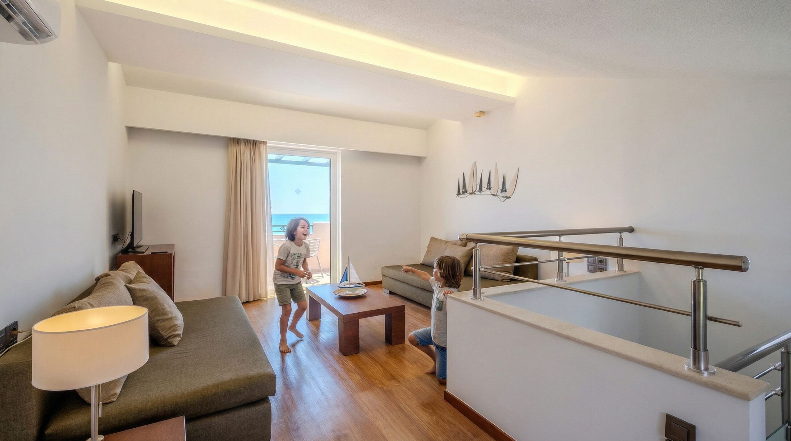 This two-storey family suite features a queen-size bed and a spacious bathroom on the first level. The second level offers a comfortable sitting area with two sofas, which can accommodate two additional guests. Each floor is equipped with its own furnished balcony, offering stunning sea views. The maisonette suites are located on the first floor of the two beachfront buildings