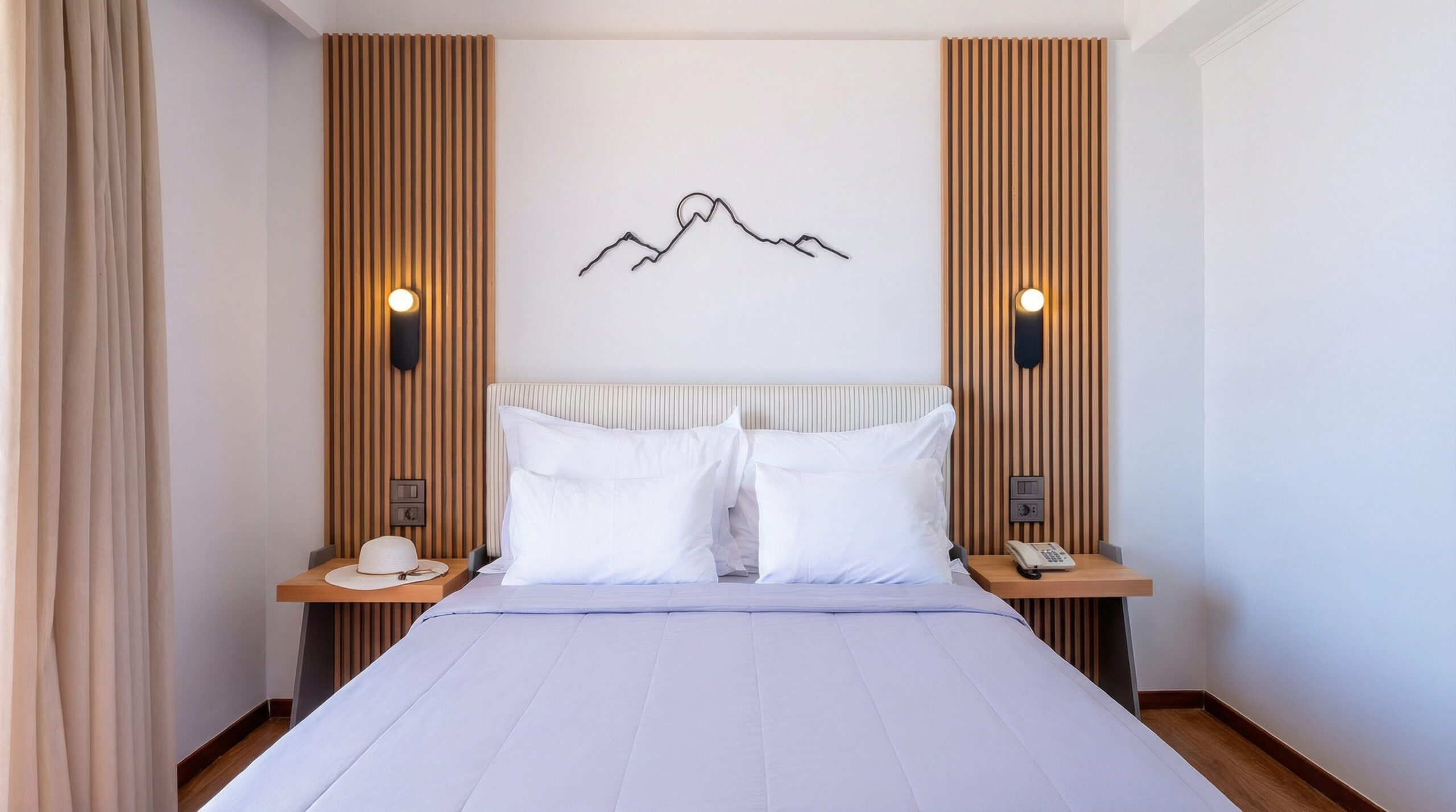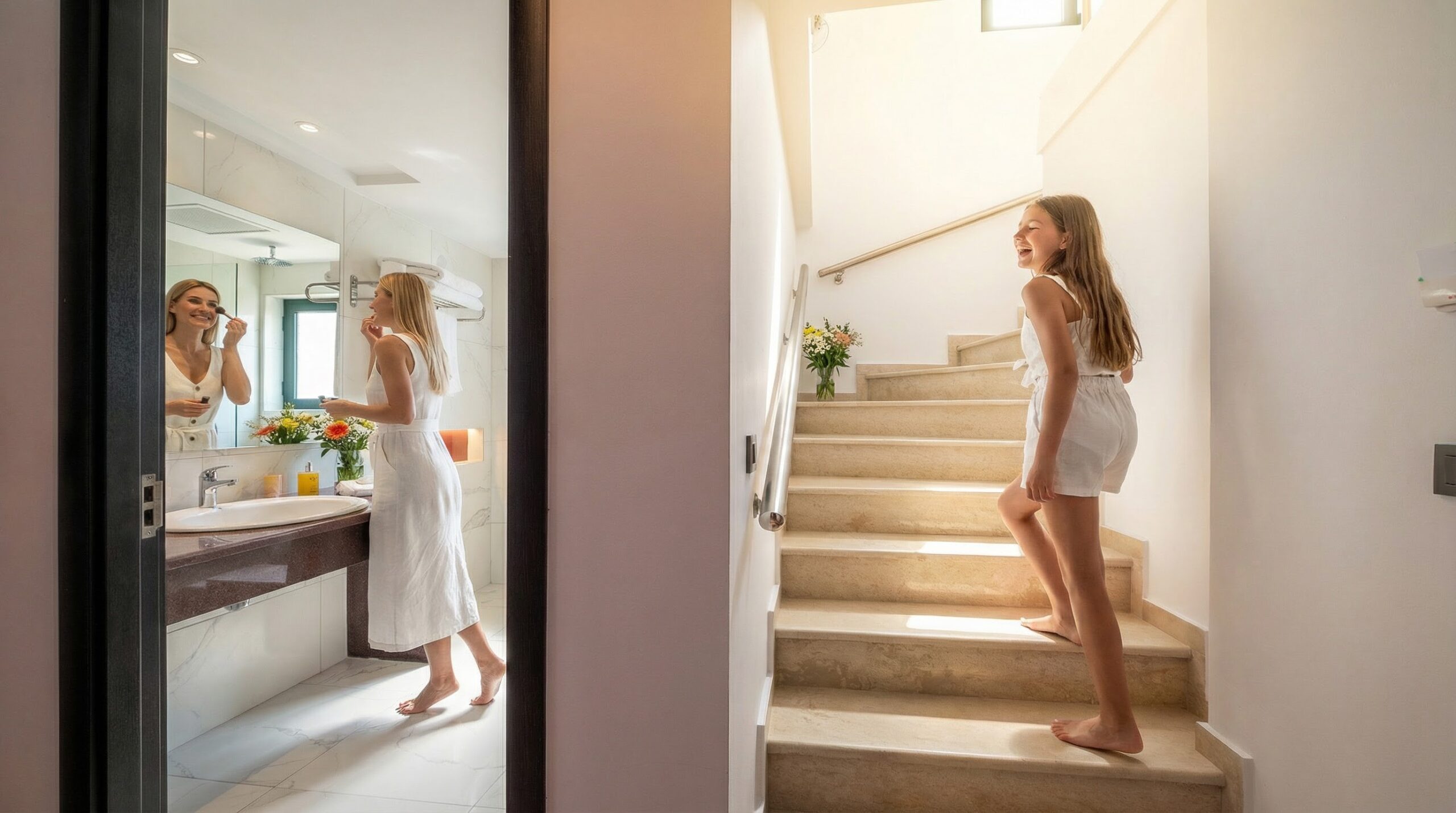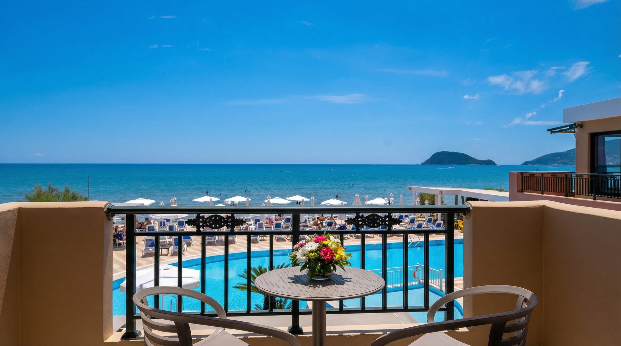 This two-storey family suite features a queen-size bed and a spacious bathroom on the first level. The second level offers a comfortable sitting area with two sofas, which can accommodate two additional guests. Each floor is equipped with its own furnished balcony, offering stunning sea views. The maisonette suites are located on the first floor of the two beachfront buildings